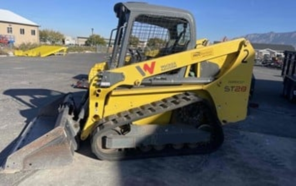 OROPS (Open Cab), Standard Flow Hydraulics, Bucket w/Edge, Forks | 2018 Wacker Neuson ST28 Skid Steer for rent. The Wacker Neuson ST28 skid steer is a compact, powerful track loader designed for versatile performance on construction, landscaping, and agricultural jobsites. It boasts a 74-horsepower Kohler turbo-charged engine, delivering a rated operating capacity of 2,800 pounds at 50% and a lift height over 119 inches. With a top speed of nearly 10 miles per hour, it reduces travel time, enhancing productivity. The spacious cab, selectable controls, and low ground pressure ensure operator comfort and efficient operation in tight spaces. Standard flow hydraulics. Comes with a straight edge bucket. Forks are an optional accessory.